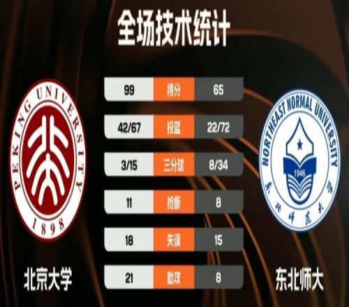 末节决战,北京大学上来就拉开30分以上领先,随后双方逐渐换上替补练兵,双方围绕着30分左右分差继续拉锯战,最后2分钟东北师大一分未得,最终北京大学99-65大胜东北师大。