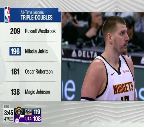 此役,约基奇轻松写意拿下生涯第196个三双,继续追逐威少的209次三双纪录。