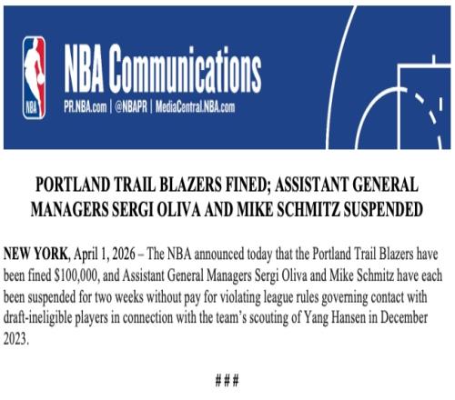 体育播报04月02日宣 今日,NBA官方宣布:“因波特兰开拓者在2023年12月考察杨瀚森期间进行违规接触被罚款10万美元。球队助理总经理奥利瓦和施米茨被停薪、停职两周。”