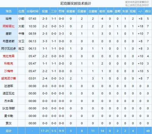 尼克斯开场后不论是先发还是替补都手感火热,首节运动战21投17中,命中率达到80.9%,其中三分5投全中,罚球9罚也是全中,单节砍下48分。