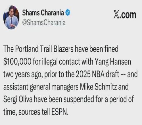 爆料王Shams:开拓者因在选秀前与杨瀚森违规接触被罚款10万美元,同时助理总经理奥利瓦和施密茨被停薪&停职两周...