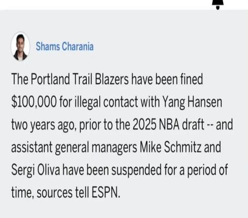 原来,这一次开拓者被罚款,是因为他们在两年前,也就是选秀大会开始之前就跟杨瀚森发生了非法接触,于是如今被罚款10万美元。此外,开拓者的两名球队高管,包括一名助理总经理,也要被停职一段时间。不得不说,开拓者为了引进杨瀚森,真是下血本了。