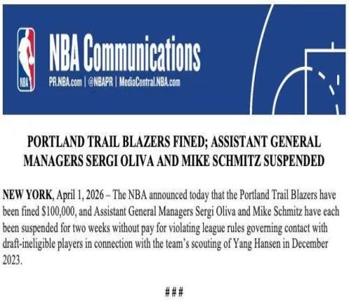今日,NBA官方宣布:“因波特兰开拓者在2023年12月考察杨瀚森期间进行违规接触被罚款10万美元。球队助理总经理奥利瓦和施米茨被停薪、停职两周。”