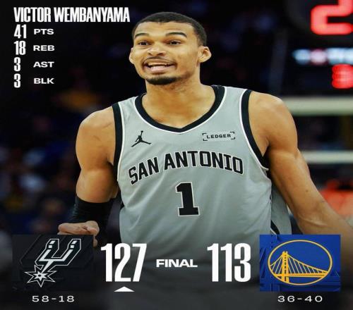 文班亚马41+18+3帽创两大NBA历史第1神迹,还刷爆纪录!马刺掀翻勇士迎10连胜!