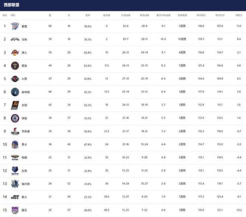 11-15名:鹈鹕(25胜51负)、灰熊(25胜51负)、独行侠(24胜52负)、爵士(21胜56负)、国王(20胜57负)