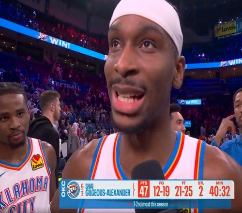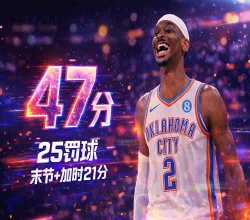 本场比赛,亚历山大出战41分钟,投篮19中12,三分3中2,罚球25中21超活塞全队(23罚),拿到47分5篮板3助攻2抢断。