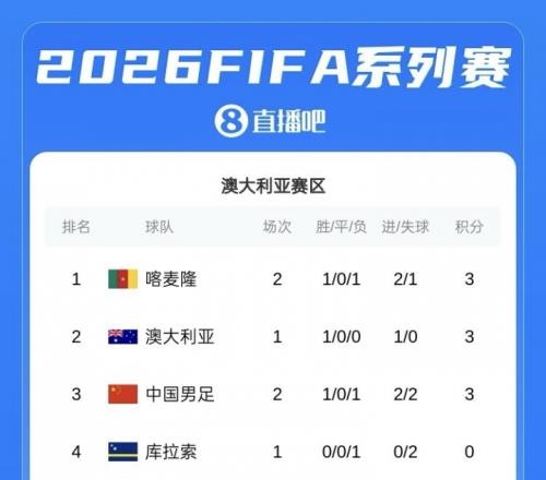 FIFA系列赛澳大利亚赛区最新积分榜上,国足积3分暂时排在第3。
