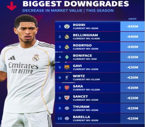 罗德里的身价跌幅高居榜首,本赛季狂跌4500万欧元,从1.1亿欧元跌至目前的6500万欧元。